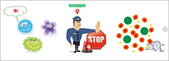 微生物通過離子運(yùn)輸營養(yǎng)維持生長繁殖,吡啶硫酮通過破壞微生物的該運(yùn)輸方式,讓營養(yǎng)運(yùn)輸不進(jìn)去,使得細(xì)菌最終被“餓死”。同時(shí),鋅離子本身也具有一定的抑菌能力。因此,吡啶硫酮鋅在殺菌的同時(shí),本身并未被消耗,可反復(fù)殺菌,具有高效、長效的殺菌能力。